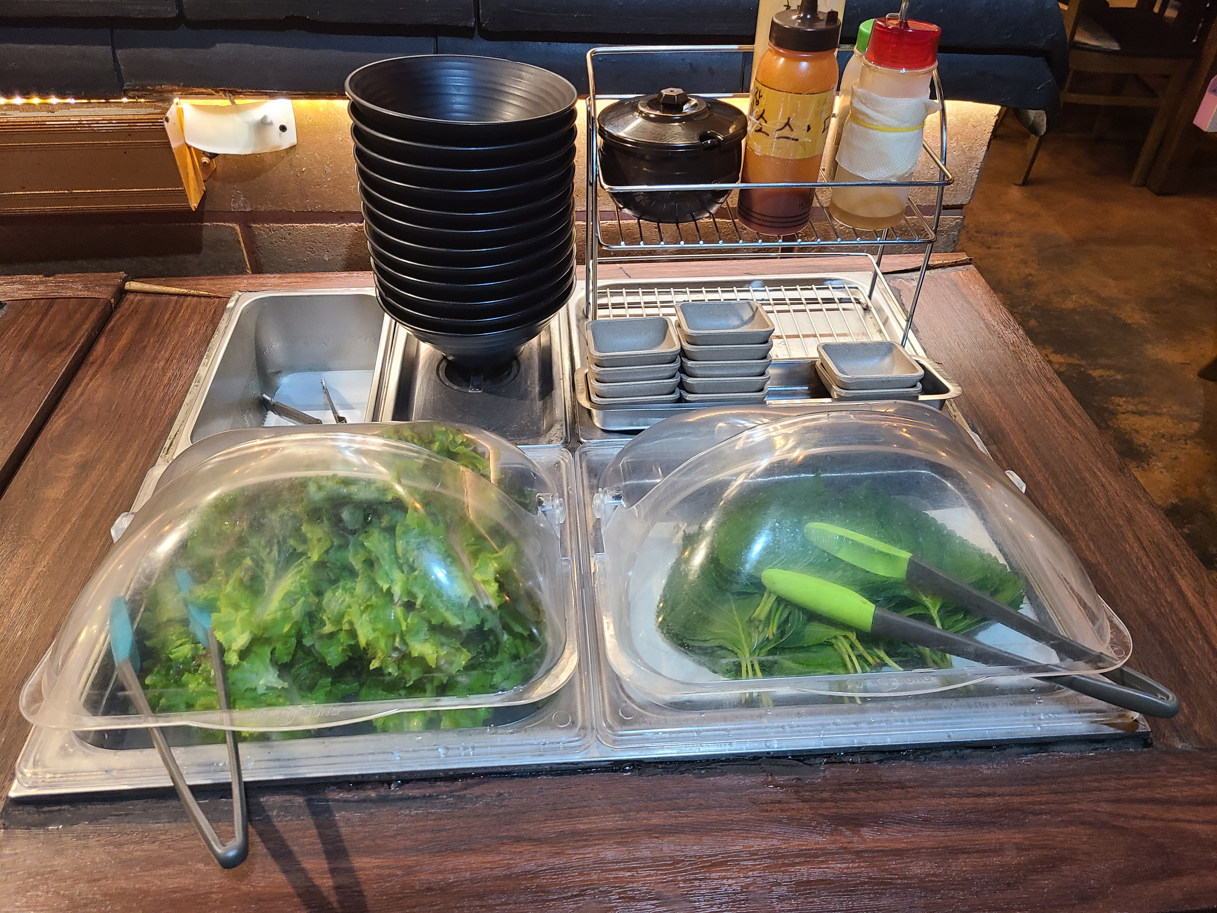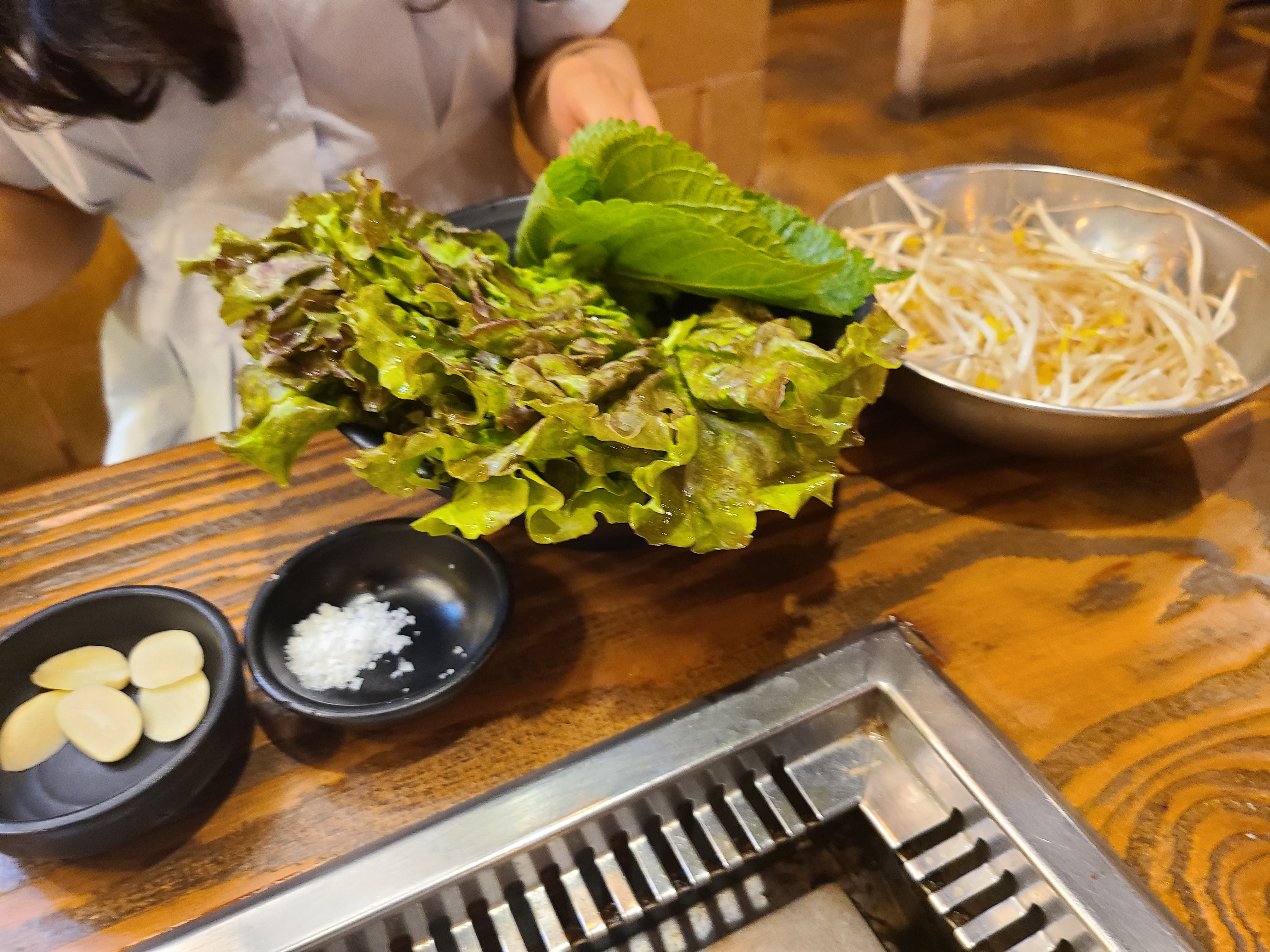 요즘 채소값들이 비싸다고 하는데, 신선한 깻잎과 상추도 마련되어 있습니다.
