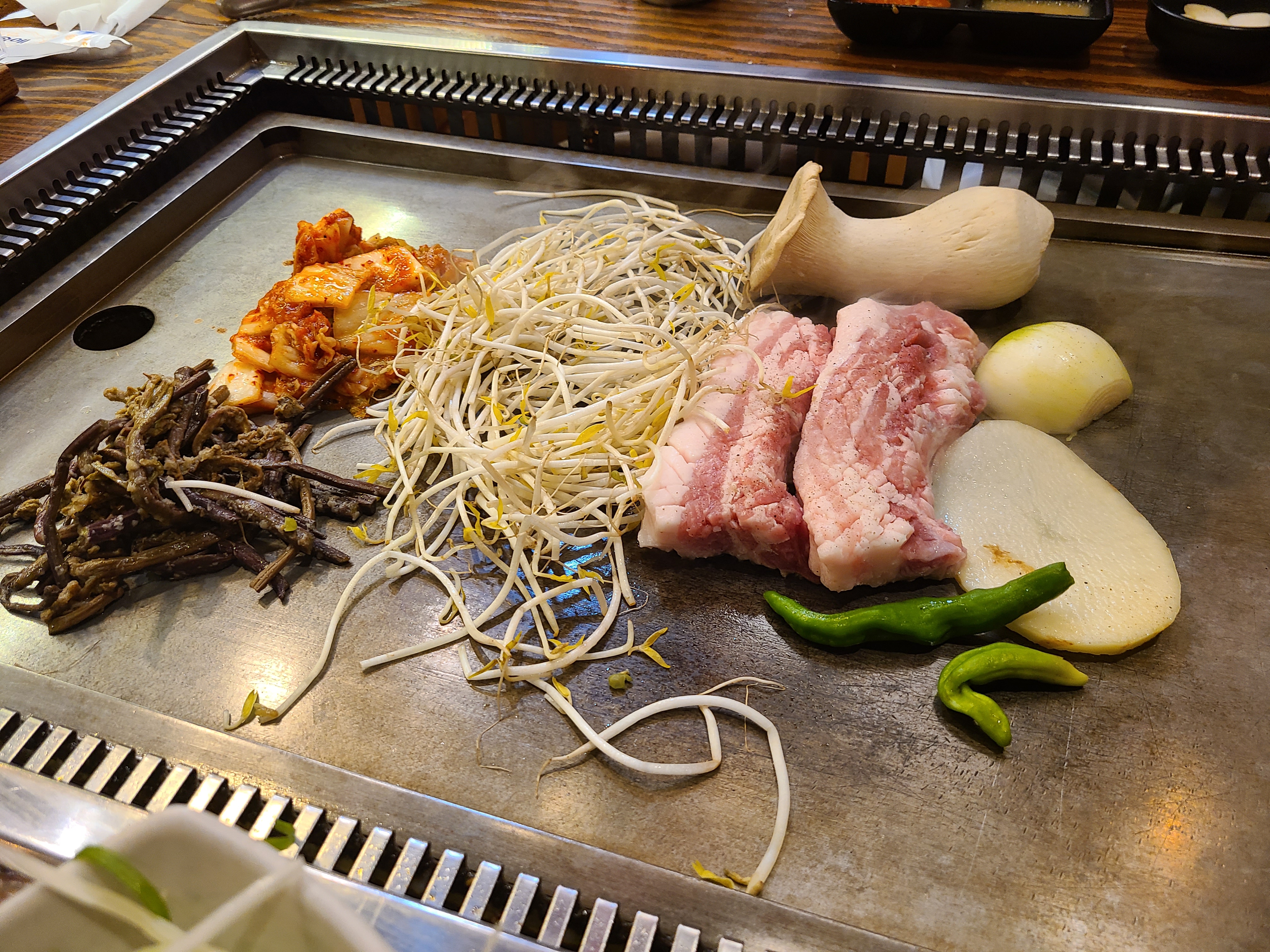 처음에 준, 고사리, 김치, 버섯, 콩나물 들을 한꺼번에 철판에 올려주셔서 구워주십니다.