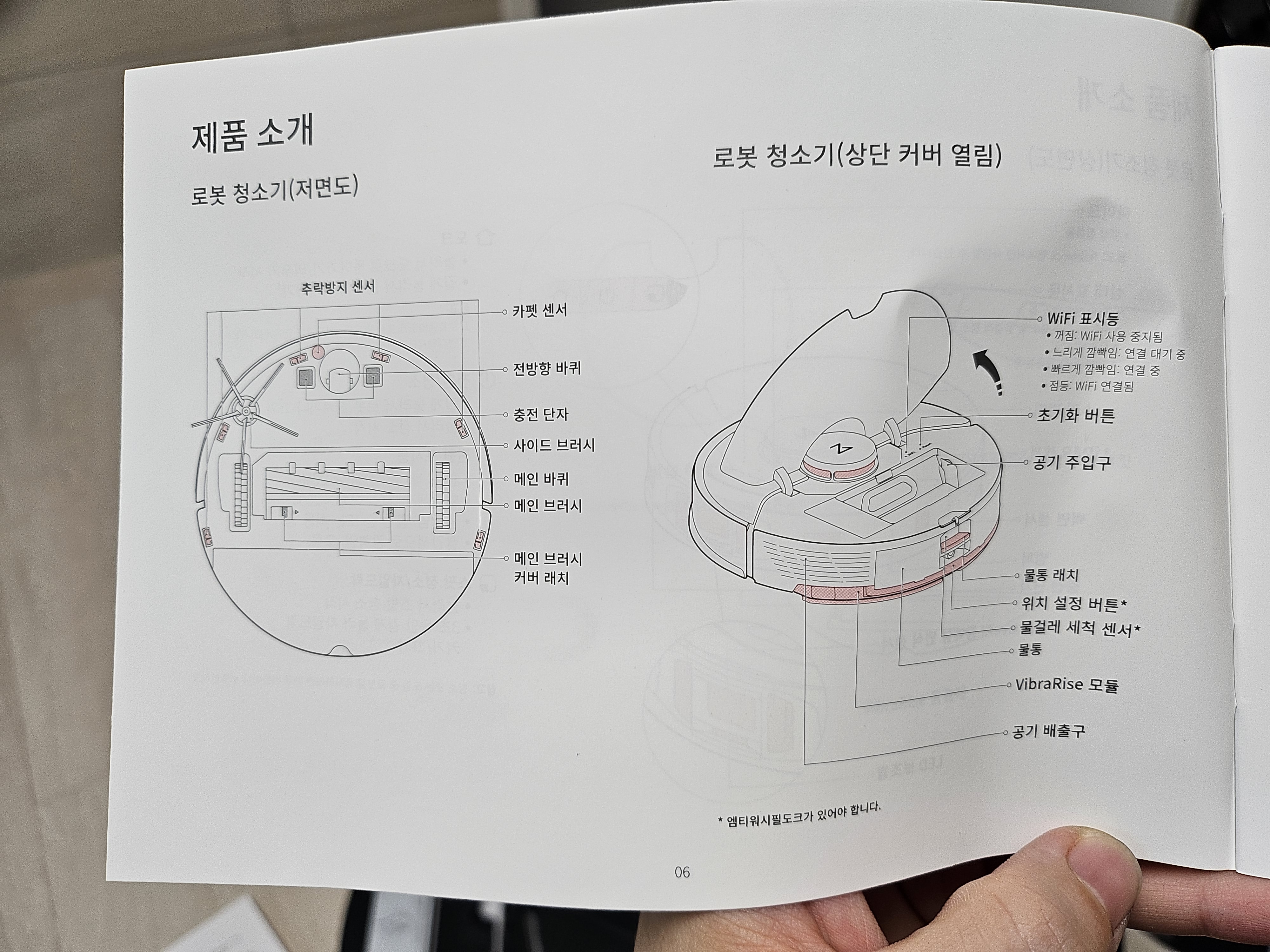 제품의 불빛이나 먼지통, 물통, 브러시 위치들도 자세히 설명서에 나와있습니다.