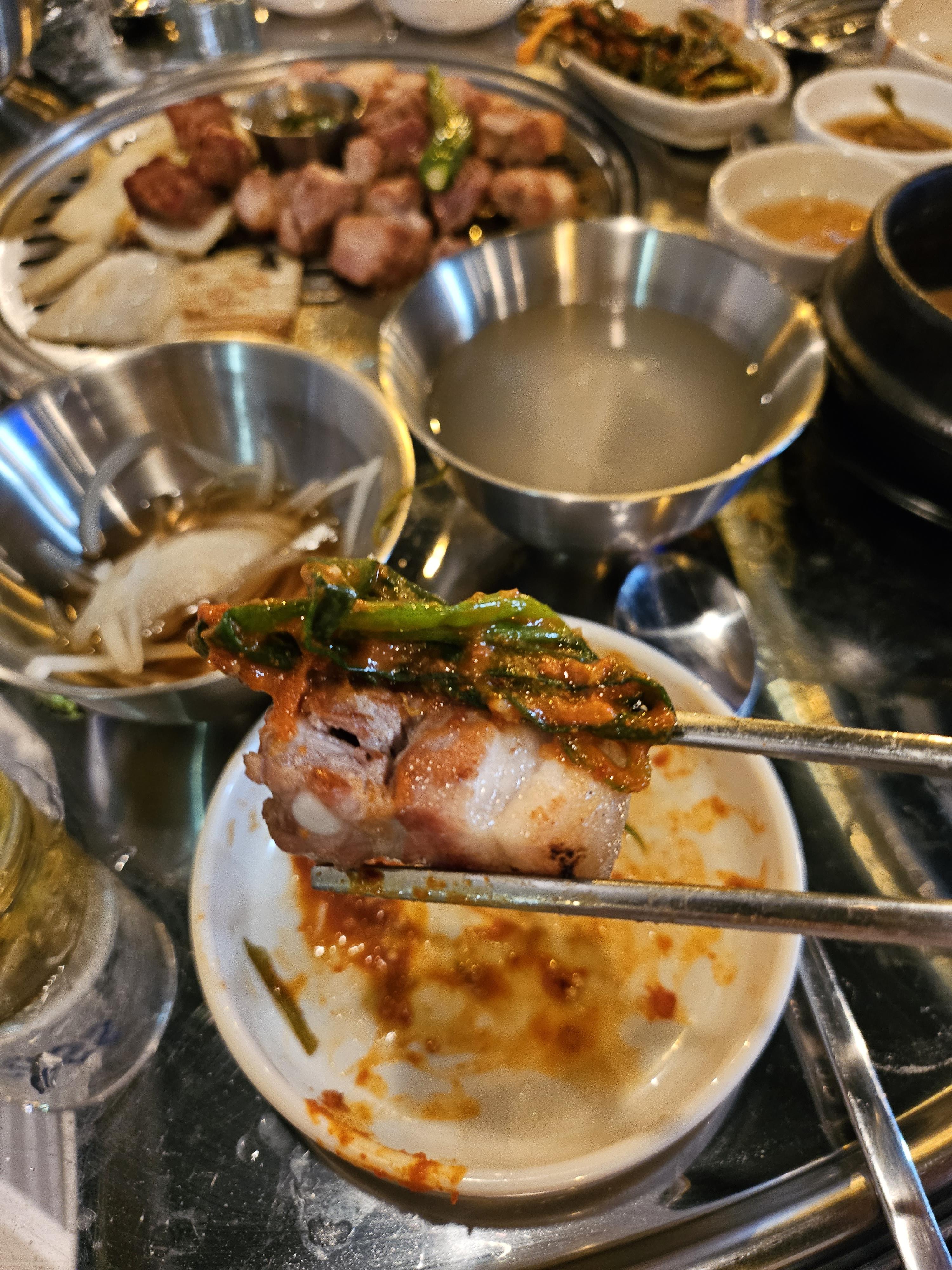 매콤한 파김치를 고기 위에 올려 먹어도 맛있더라구요
