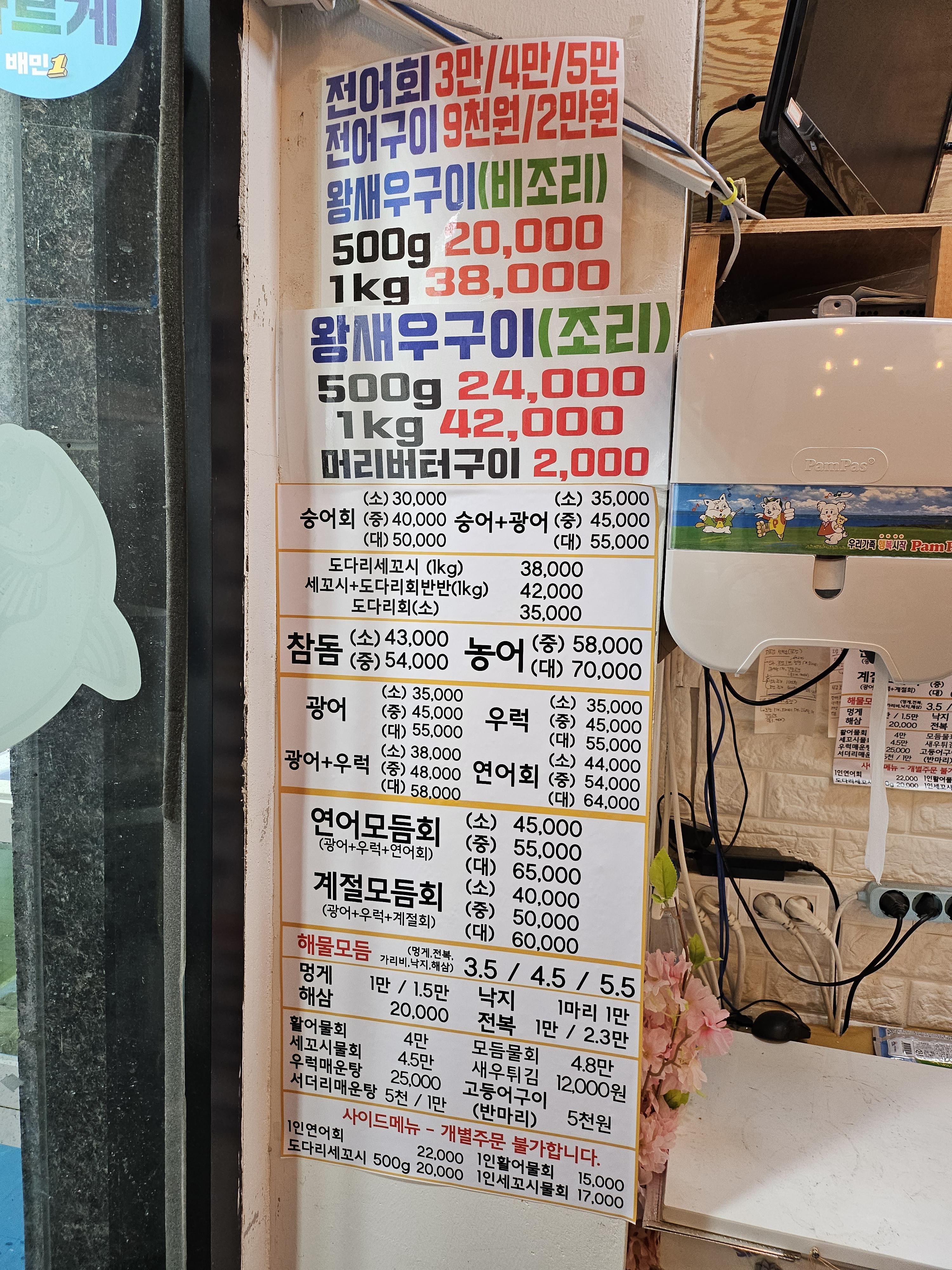 매장에서 먹을 경우, 참돔, 농어, 숭어회, 모듬회 가격은 4.5만원에서부터 ~ 7만원까지 사이즈별로 있습니다.