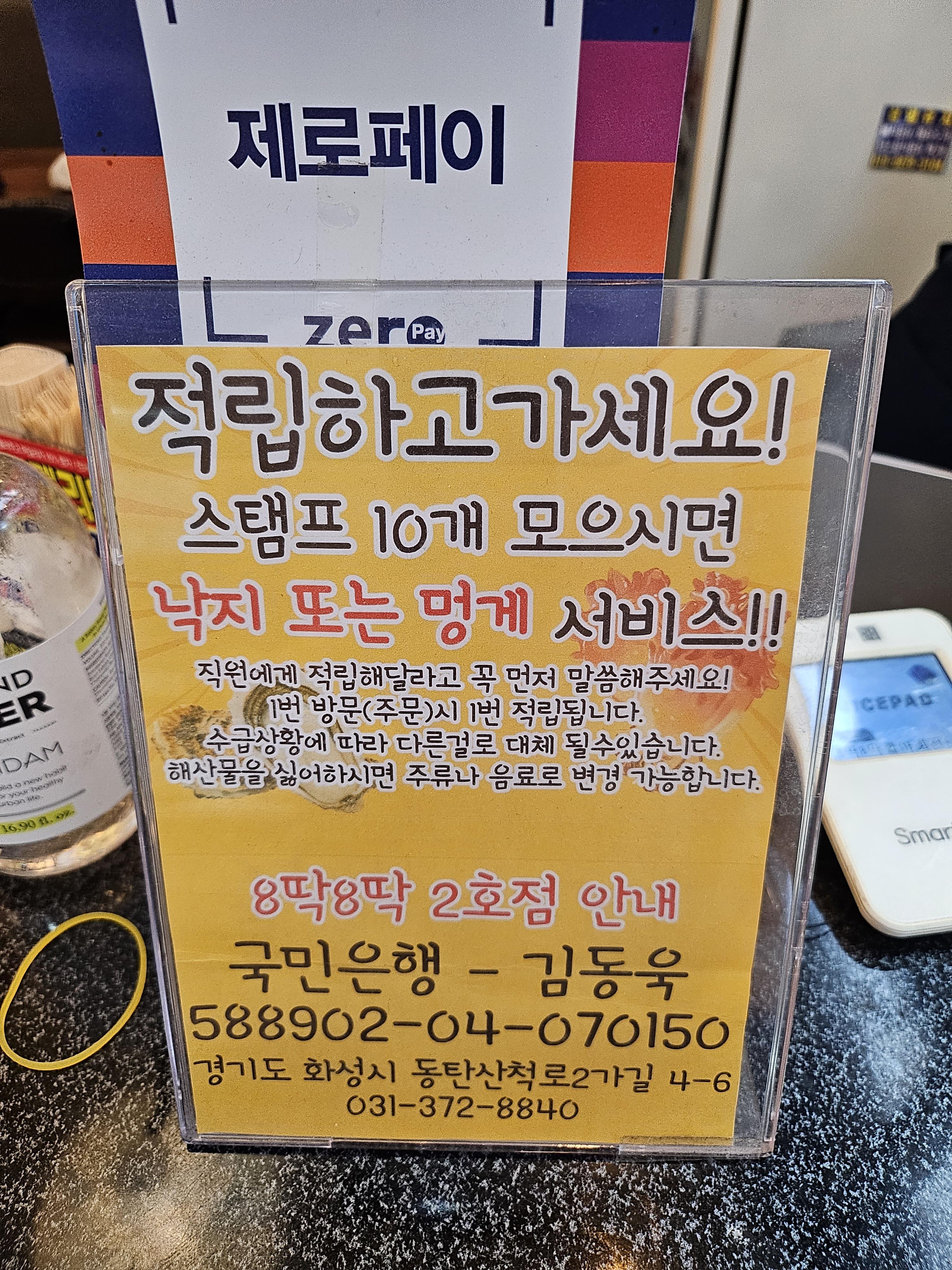 제로페이 그리고 구매시마다 적립을 통해 낙지 또는 멍게 서비스를 받으실 수 있습니다.