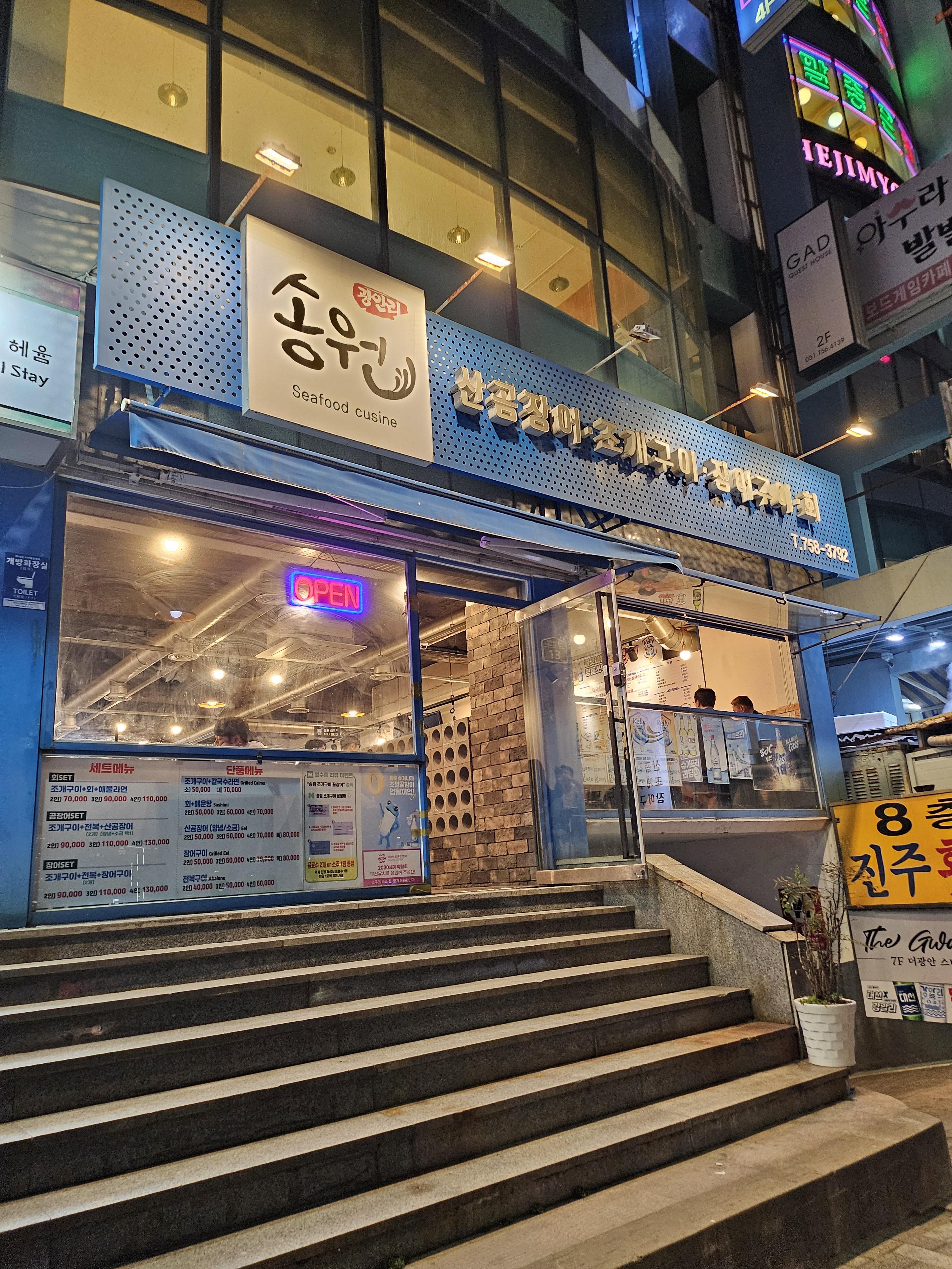 가게 이름은 "송원 조개구이 꼼장어"입니다.